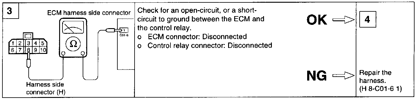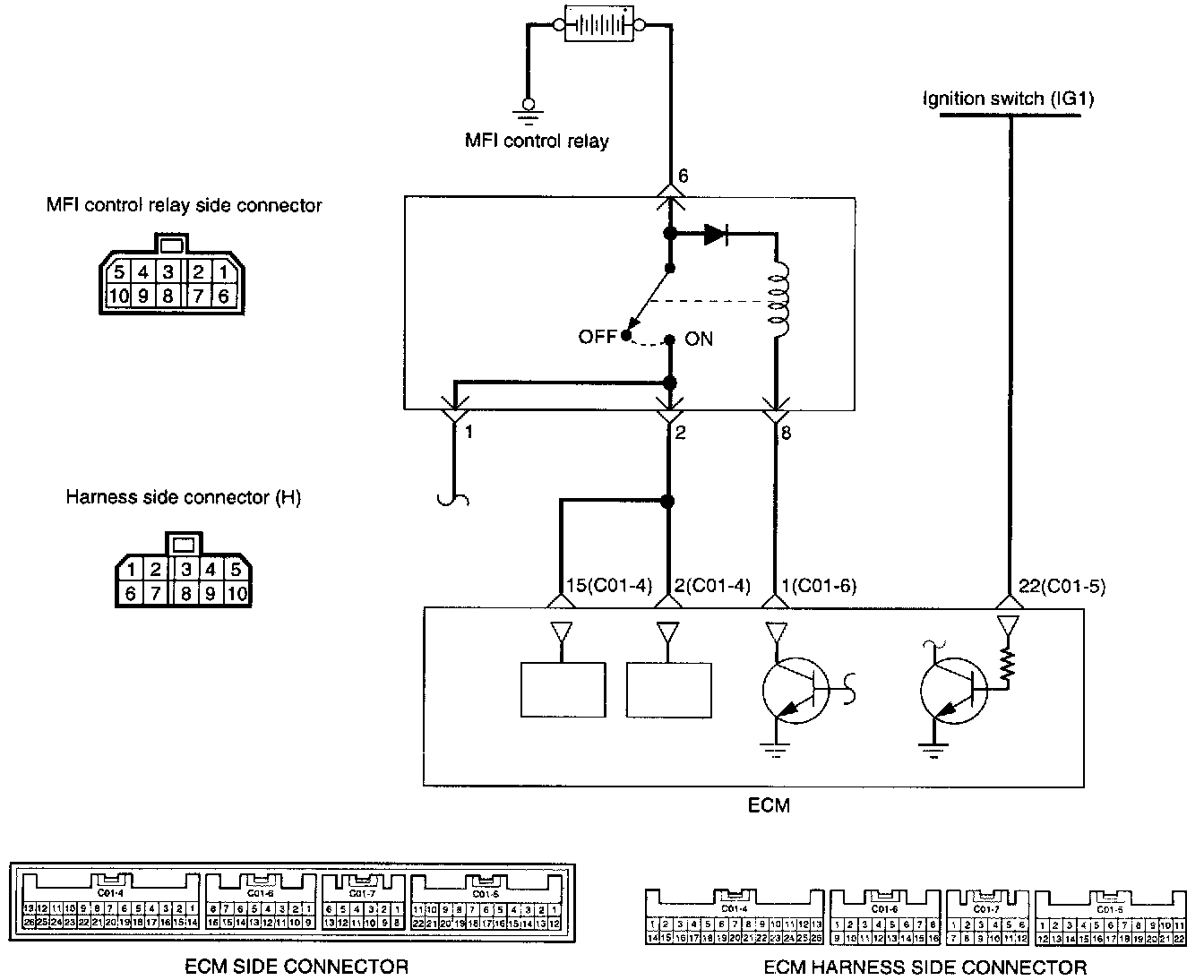 1. Connect a 12V power supply (+) terminal to terminal 6 of the MFI control relay and measure the voltages at terminal 1 when the (-) terminal is connected to and disconnected from the terminal 8.