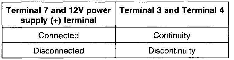 3. Connect a 12V power supply (+) terminal to terminal 3 of the MFI control relay. Measure the voltages at terminal 4 when the (-) terminal is connected to and disconnected from the terminal 9.