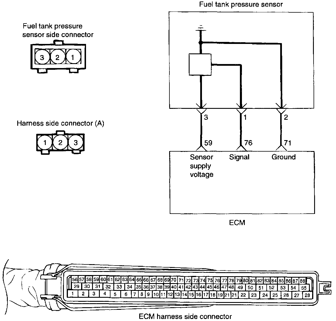 If voltage is not within spec. as procedures, there is leakage. Inspect the fuel tank and hoses toward canister and fuel neck. Repair or replace defective parts.