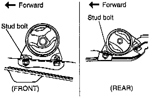 6. Temporarily tighten the front roll stopper bracket bolt. After the total weight of the engine has been placed on the vehicle body, securely tighten the nut then tighten the components listed below to specifications.