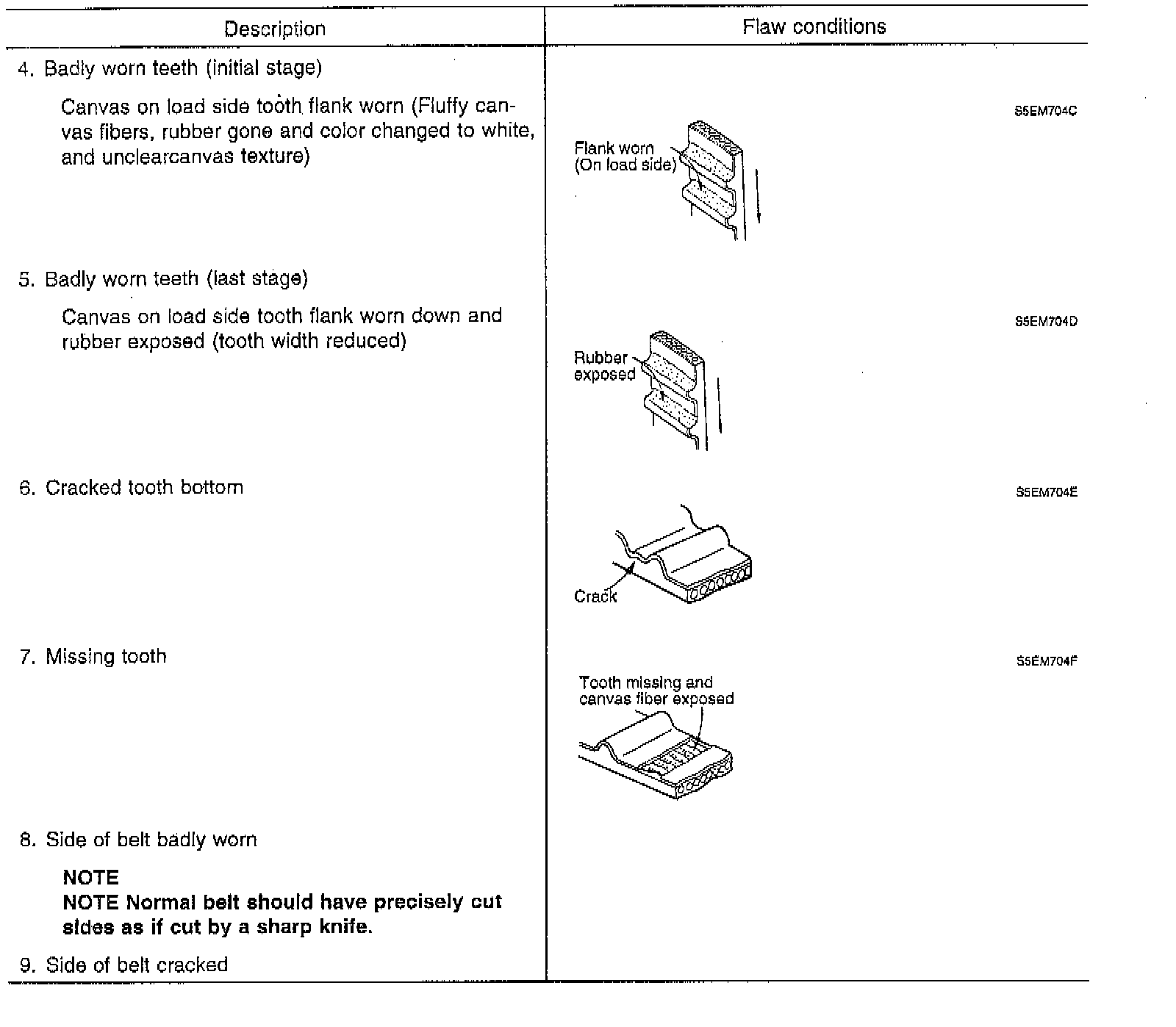 2. When the engine is overhauled or belt tension adjusted, carefully check the belt. If any of the flaws in the charts are evident, replace the belt.