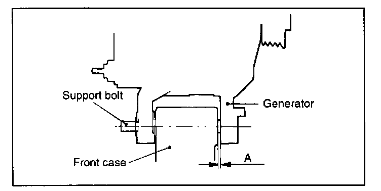 2. Push the generator forward and determine how many spacers (thickness: 0.198 mm) should be inserted between the front leg of the generator and the front case (space A in the illustration). (There should be enough spacers so that they do not fall out when you let go of them.)