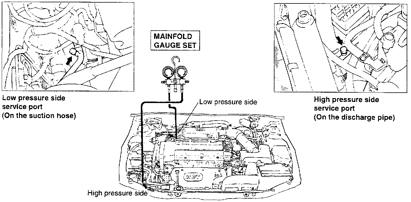 2. Install charging hoses of gauge set to service ports. Connect the low pressure hose to the low pressure service Port in the suction pipe and the high pressure hose to the high pressure service port in the discharge hose.