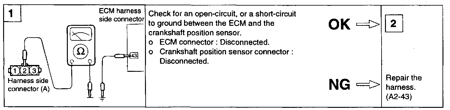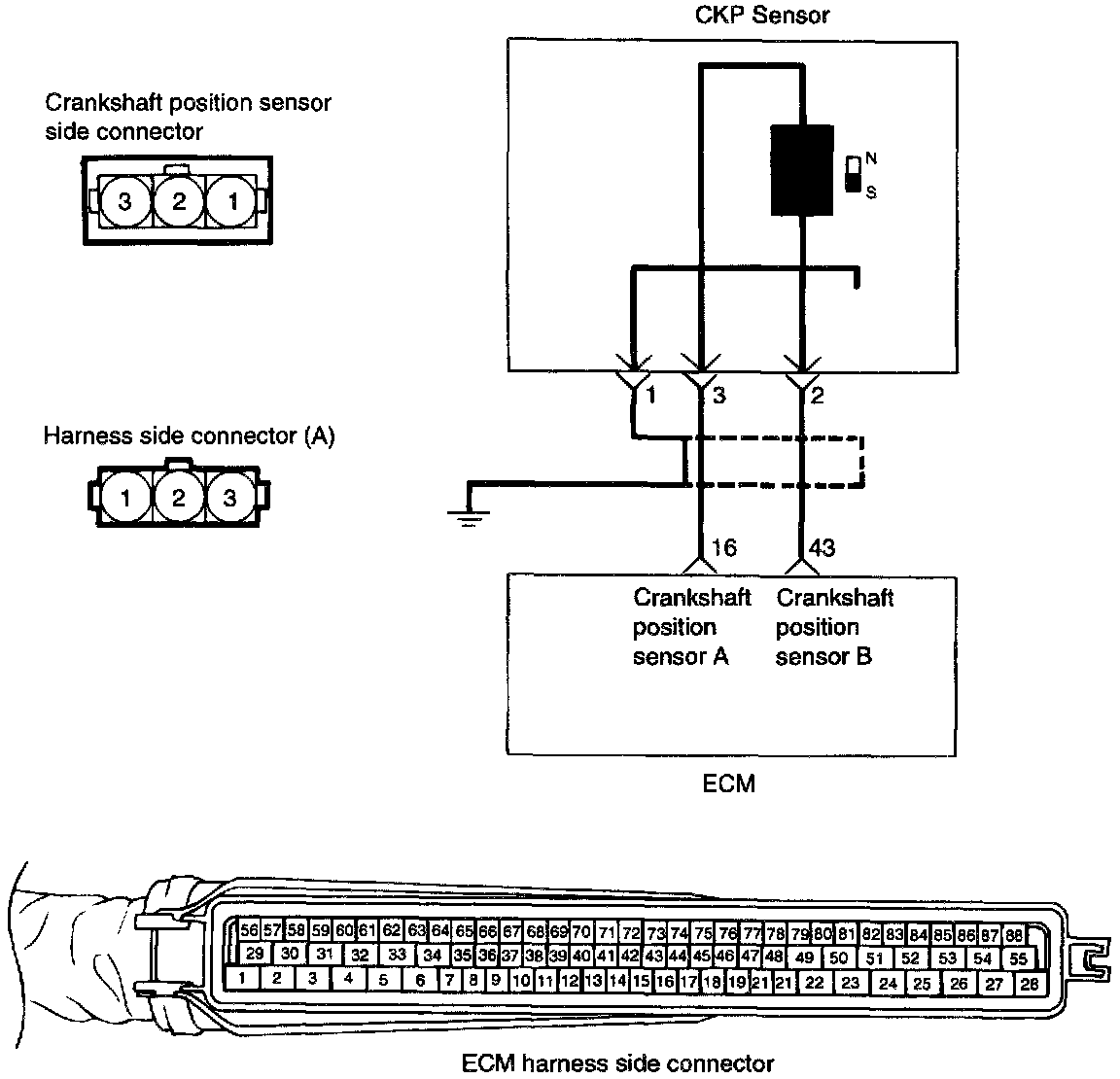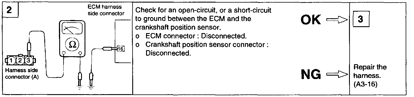 1. If unexpected misses are felt during driving or the engine stalls suddenly, shake the crankshaft position sensor harness. If this causes the engine to stall, check for poor contact at the sensor connector.