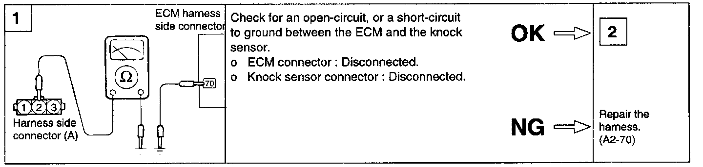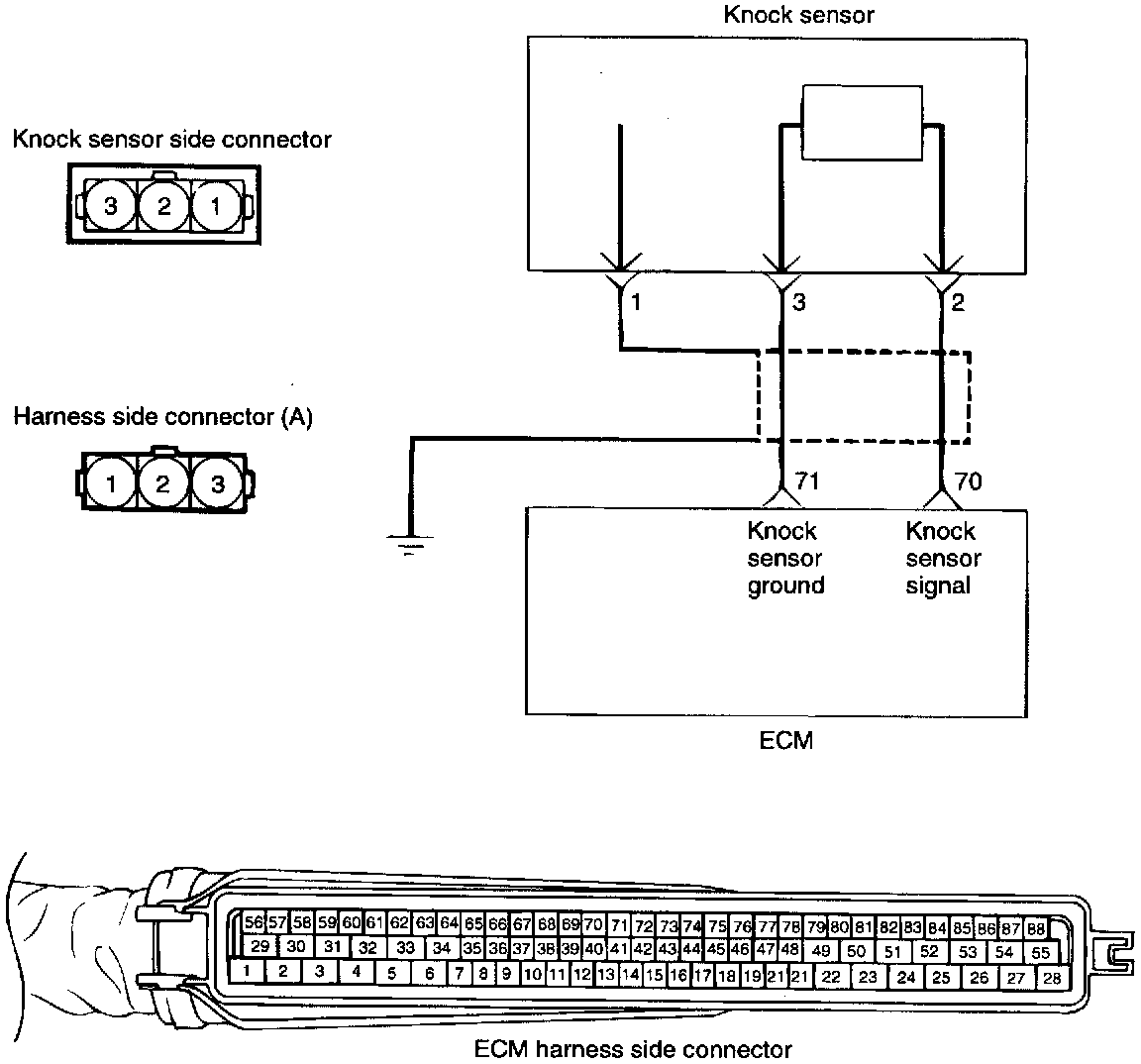 The knock sensor is attached to the cylinder block and senses engine knocking conditions. A knocking vibration from the cylinder block is applied as pressure to the piezoelectric element. This vibrational pressure is then converted into a voltage signal which is delivered as output. If engine knocking occurs, ignition timing is retarded to suppress it.