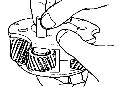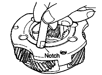 5. Insert the pinion shaft. Be sure that the flattened end of the pinion shaft fits properly into the hole in the rear thrust plate when the pinion shaft is inserted.