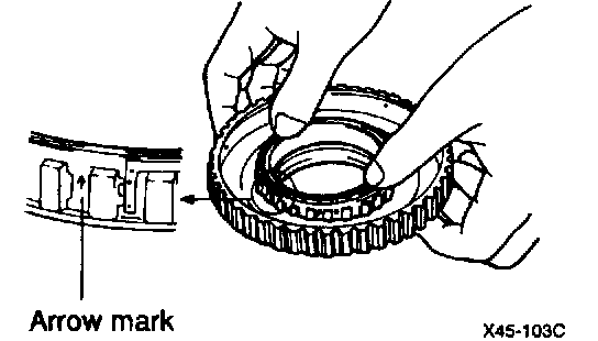 7. Press the overrunning clutch into the outer race. Be sure that the arrow on the outside circumference of the cage is pointing upward as shown in the illustration when the overrunning clutch is installed.