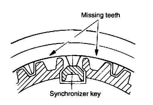 4. The synchronizer sleeve has teeth missing at six positions. Assemble the hub to the sleeve so that the center tooth between the two missing teeth touches the synchronizer key.