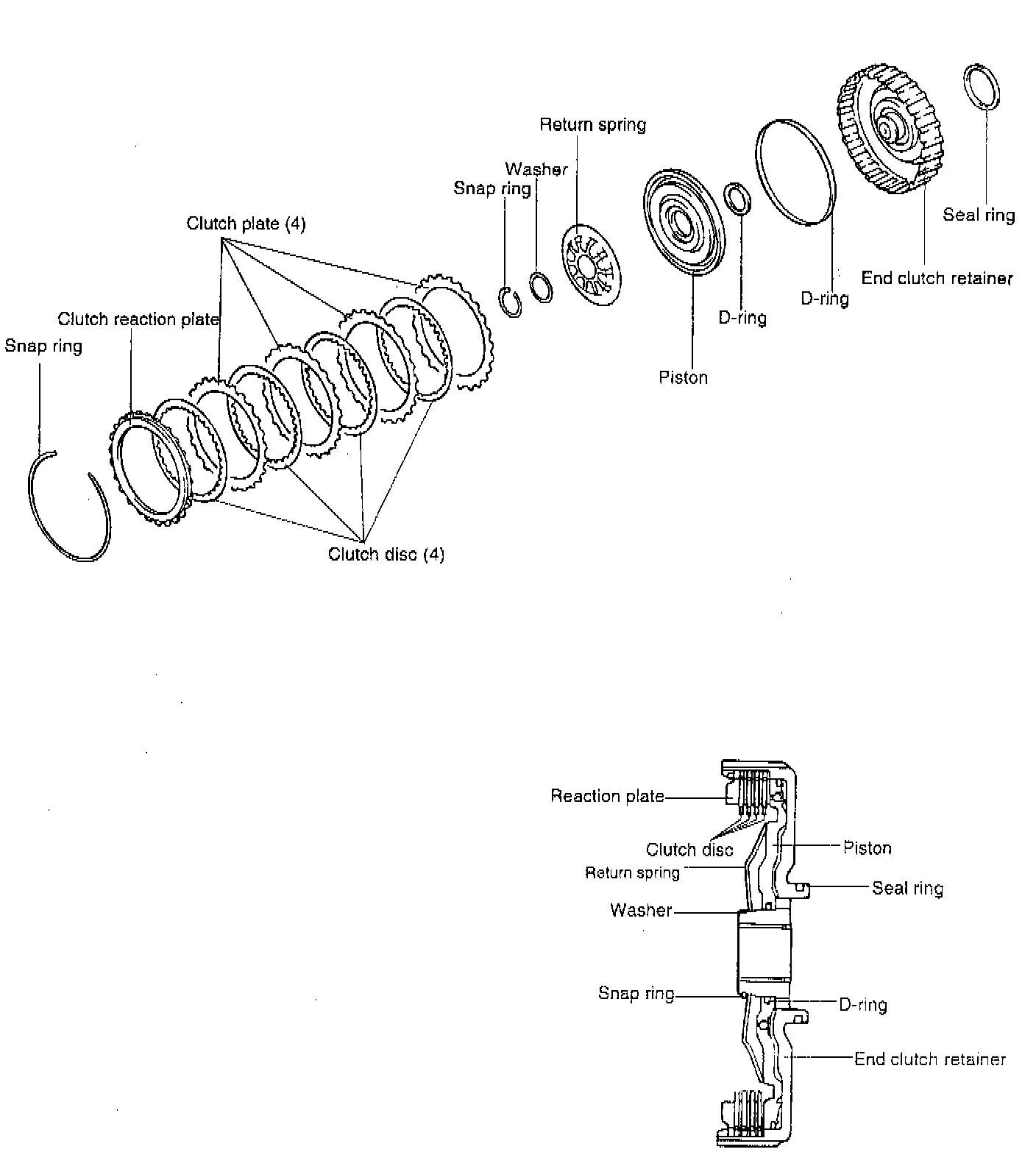 5. Install the clutch plate, clutch disc and reaction plate to the end clutch retainer. if the reaction plate, clutch plate and clutch disc are reused, install them in the same order they were disassembled. Apply a coating of automatic transaxle fluid.
