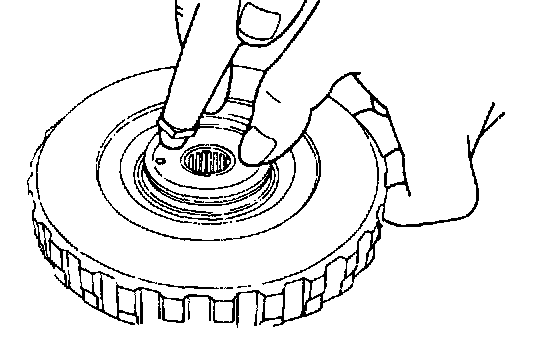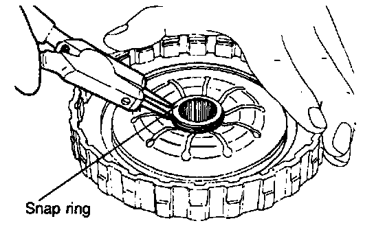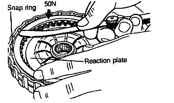 6. Install the snap ring. Check to see that the clearance between the snap ring and the clutch reaction plate is 0.60 - 0.85 mm (0.024 - 0.033 inch) To check the clearance, hold the circumference of the clutch reaction plate down with 50 Nm (11 lbs..) force. If the clearance is out of specification, adjust the clearance by selecting the proper snap ring.