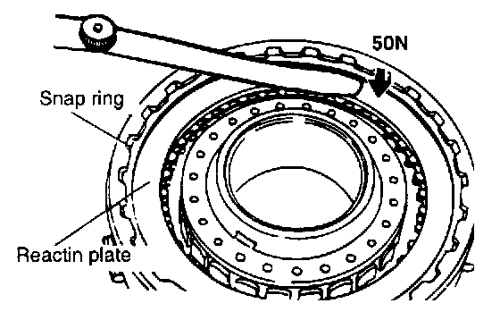 6. After installing the snap ring, check to see if there is a 0.8 - 1.0 mm (0.031 - 0.039 inch) clearance between the snap ring and the clutch reaction plate. To check clearance, hold the entire circumference of the clutch reaction plate down with 50 N (11 lbs.) force. If the clearance is out of specification, adjust by selecting the proper snap ring.