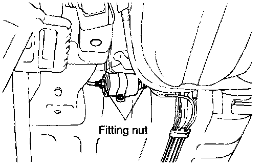 CAUTION: Be sure to reduce the fuel pressure before disconnecting the fuel feed pipe, otherwise fuel will spill out. Cover the pipe connection with shop towel to prevent fuel from splashing (caused by residual pressure in the fuel line).1. Raise the vehicle and remove the two fitting nuts while holding the fuel filter nut securely.