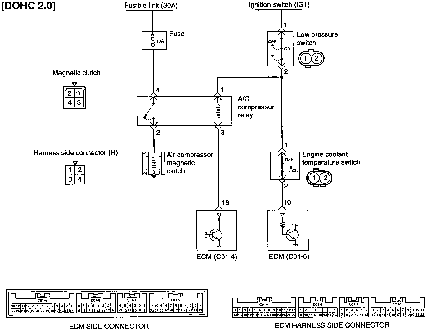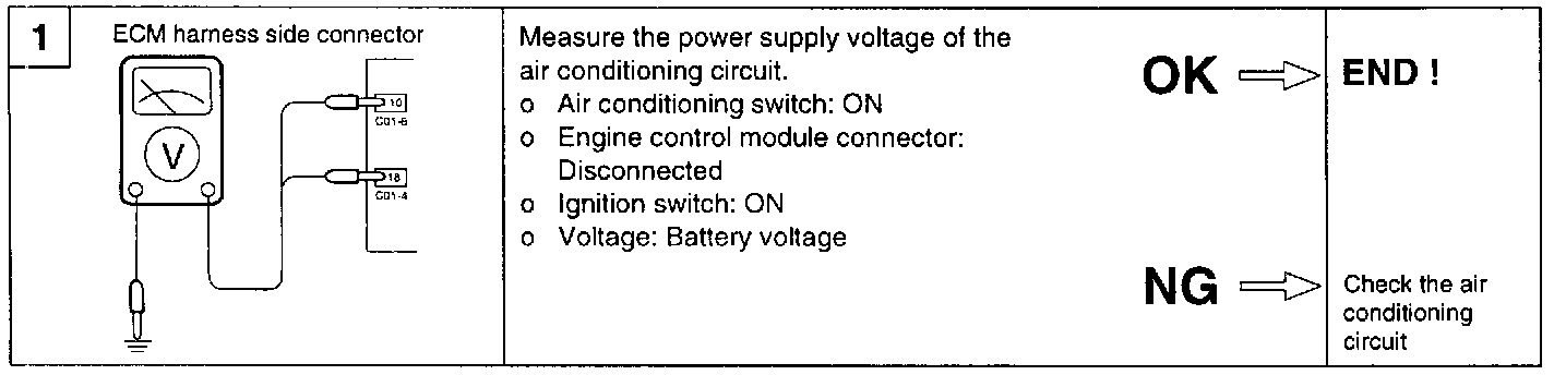 NOTE: If the air compressor magnetic clutch is not activated when the air conditioing switch is turned on during idling, faulty air conditioning control system is suspected.