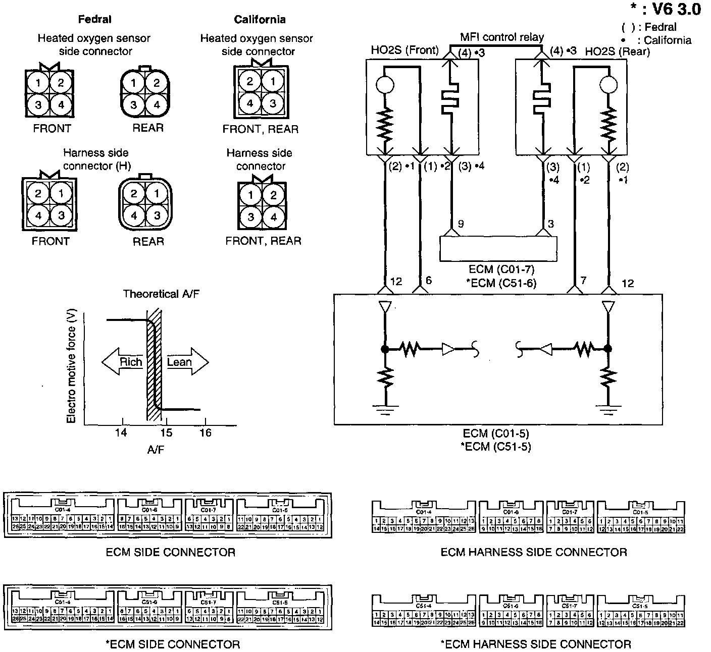 HEATED OXYGEN SENSOR (HO2S) - IIThe heated oxygen sensor senses the oxygen concentration in exhaust gas, converts it into a voltage, which is sent to the ECM. The oxygen sensor outputs about 1V when the air fuel ratio is richer than the theoretical ratio, and outputs about 0V when the ratio is leaner (higher oxygen concentration in exhaust gas.). The ECM controls the fuel injection ratio based on this signal so that the air fuel ratio is maintained at the theoretical ratio. The oxygen sensor has a heater element which ensures the sensor performance during all driving conditions.