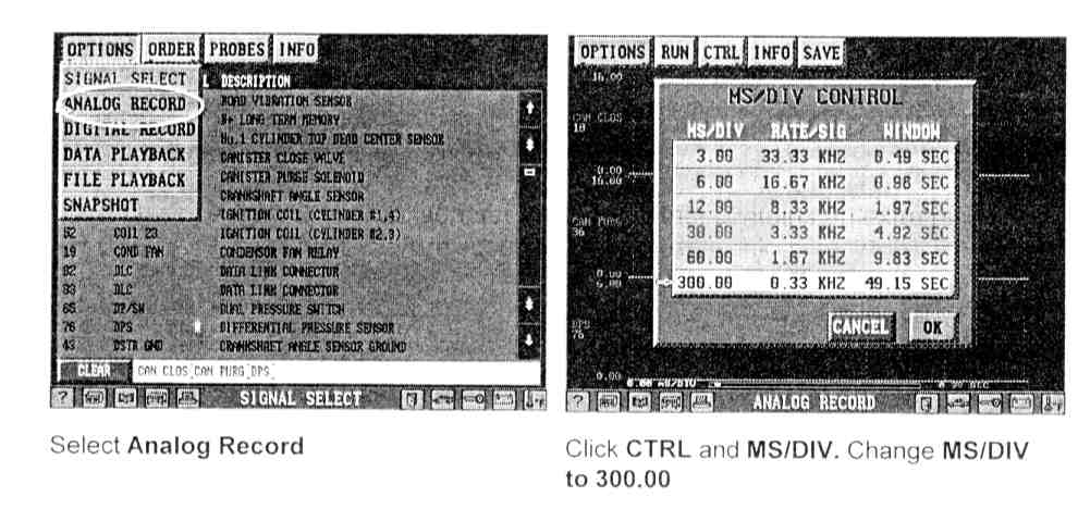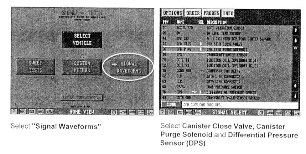 The Evaporative Emission System Trigger Test works best in combination with HDS and is found in the "Select Systems" menu on the Scan Tool.1. Set up the HDS as you normally would to monitor the Evap System by selecting from the "Signal Waveforms" screen the Canister Close Valve, the Canister Purge Valve and the Differential Pressure Sensor (DPS). Set the MS/DIV (millisecond/division) to 300.