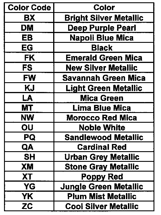 The exterior color codes are read from the FMVSS VIN label at the base of the Drivers side "B" pillar. The 4 digit color code has the exterior color followed by the interior color. For example, "EBLK" indicates a black (EB) exterior with a gray (LK) interior.