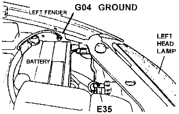 5. Attach the ground wire of the field fix kit to the original ground wires (at G04) and reinstall the ground bolt. Tighten the bolt to specification (9-11 Nm (93-110 kg.cm, 6.5-8.0 lb.ft)).