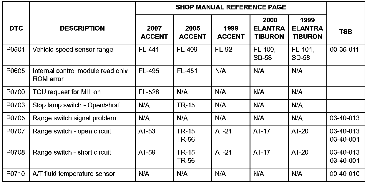 1996-2000 ELANTRA, 1997-2001 TIBURON AUTOMATIC TRANSAXLE DIAGNOSTIC TROUBLE CODES LIST