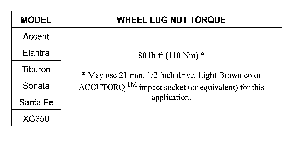 Air impact tools can generate up to 300 lb-ft (400 Nm) of torque. This amount of torque exceeds the Hyundai wheel lug nut torque specification. Overly torqued and/or unevenly torqued wheel lug nuts may cause the following: