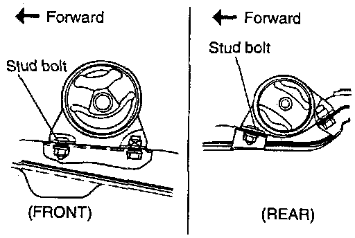 6. Temporarily tighten the front roll stopper bracket bolt. After the total weight of the engine has been placed on the vehicle body, securely tighten the nut.