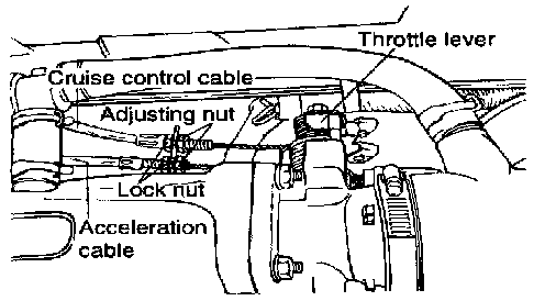 5. While keeping the throttle lever touching the cruise control lever, tighten the adjusting nut of the acceleration cable in the direction to lessen its play. Then unscrew the adjusting nut the specified number of turns just before the throttle lever begins to move.