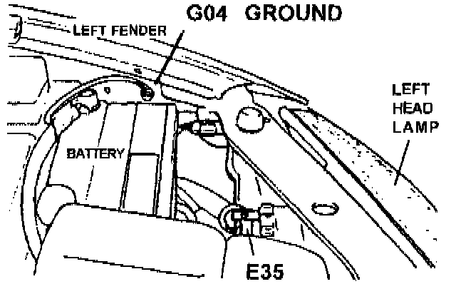 5. Attach the ground wire of the field fix kit to the original ground wires (at G04) and reinstall the ground bolt. Tighten the bolt to specification (9-11 Nm (93-110kg.cm, 6.5-8.0 lb.ft)).