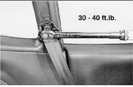 7. Reinstall the upper anchor to the 'B' pillar. Torque the mounting bolt to 30 - 40 ft.lb. (40 - 50 Nm). Verify the upper anchor rotates freely.