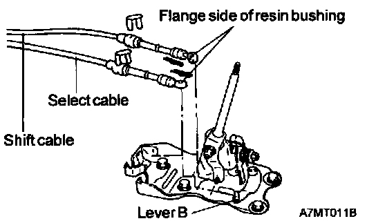 3. The flange side of the resin bushing at the select cable end should be at the lever (B) end surface.