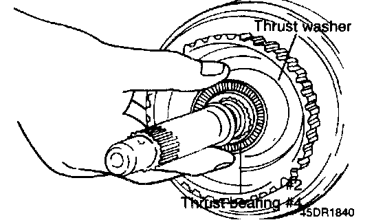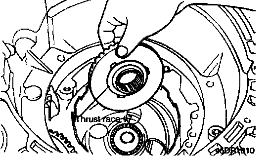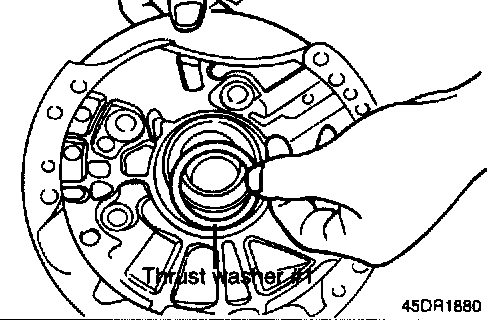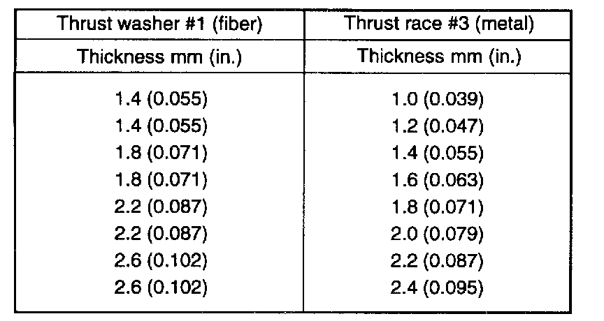When the thrust race is replaced with that of a different thickness, also replace thrust washer #1 located between the oil pump and front clutch. Use a washer of proper corresponding thickness corresponding to thrust race. Find correct pair of thrust races (metal) and thrust washers (fiber) from following table.