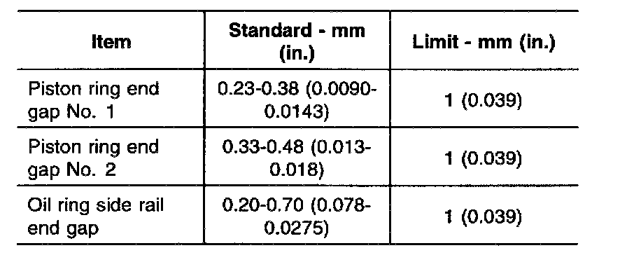2. To measure the piston ring end gap, insert a piston ring into the cylinder bore. Position the ring at right angles to the cylinder wall by gently pressing it down with a piston. Measure the gap with a feeler gauge. If the gap exceeds the service limit, replace the piston ring.