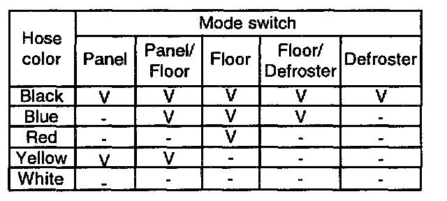 4. Check for vacuum hiss from the mode switch and vacuum hoses, and inspect for air flow between each hoses when the mode switch is at the each positions as shown.