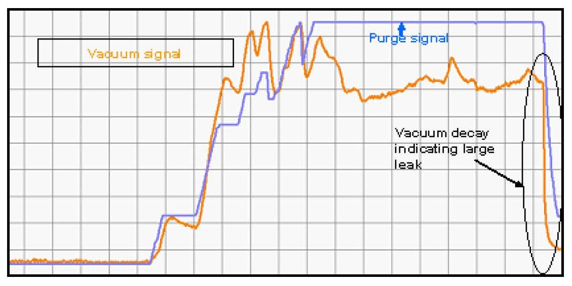 ^ The second check performed is the P0455 (Large Leak Detect). This diagnostic is accomplished by closing the normally-open canister close valve (CCV) and opening the normally-closed purge valve while monitoring the fuel tank pressure sensor signal until -10 in H2O (vacuum) is achieved. Once the FTPS achieves target vacuum, the PCSV is commanded "closed" and the vacuum decay is measured. If a leak in excess of a 0.100" hole is detected, then DTC P0455 is set.