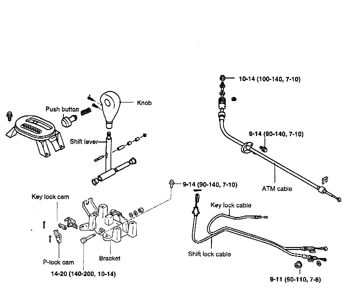 (2) Install shift lock cable and key lock cable in position. In this case, key lock cable must be fixed to key cylinder and shift lock cable must be fixed to brake pedal in position.