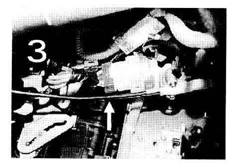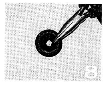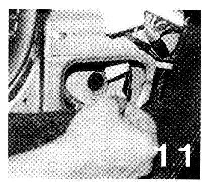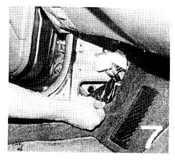 8. Carefully remove the rubber grommet from the driver's kick panel cavity. Be sure not to drop it Using a pair of sharp cutters, cut a hole in the center of the grommet approximately 3/8" in diameter as shown in photo 8.