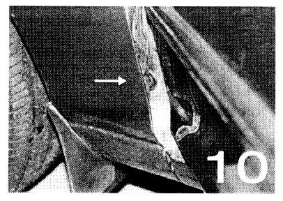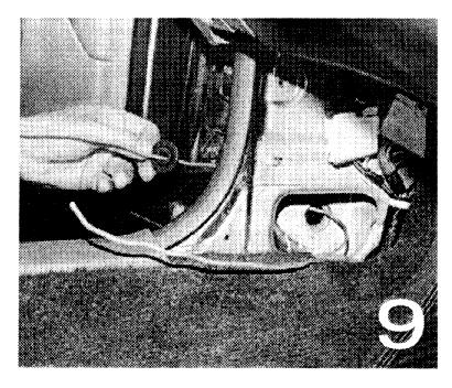 9. Using a piece of scrap wire cut about 3 feet long, thread the scrap wire through the hole in the driver's kick panel cavity that was previously tilled by the grommet. Slip the grommet over the wire and slide it down the wire through the doorjamb to the hole it was in previously as shown in photo 9. The wire prevents you from dropping the grommet. Make sure that the grommet is fully seated, then remove the scrap wire.