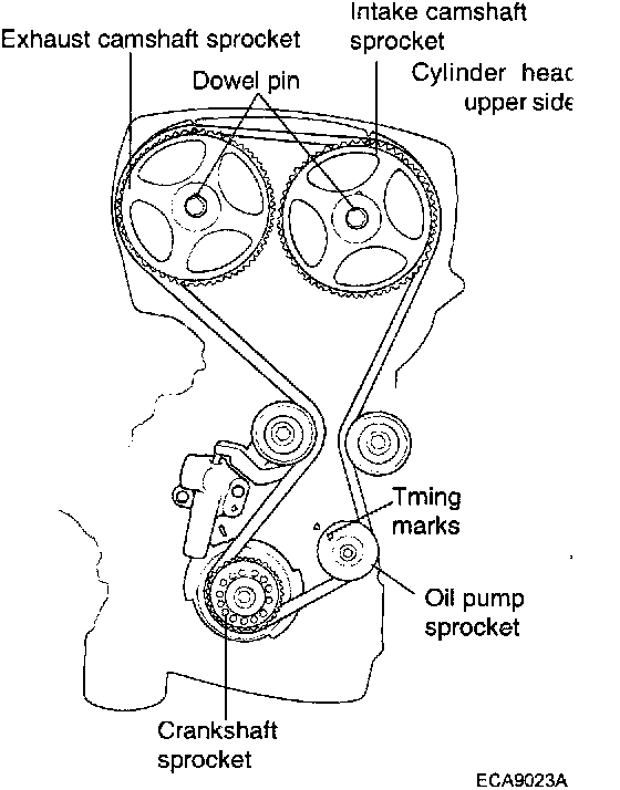 At this time the timing marks of the camshaft sprocket and the upper surface of the rocker cover should coincide, and the dowel pin of the camshaft sprocket should be at the upper side. Remove the auto tensioner.