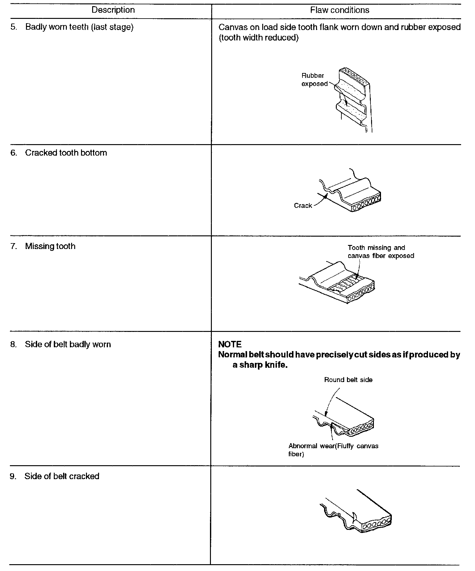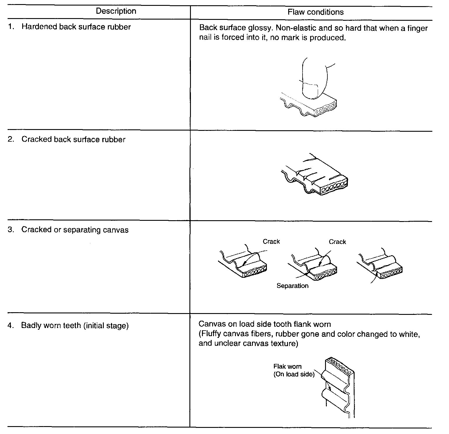 2. When the engine is overhauled or belt tension adjusted, check the belt in detail. If the following flaws are evident, replace the belt with a new one.