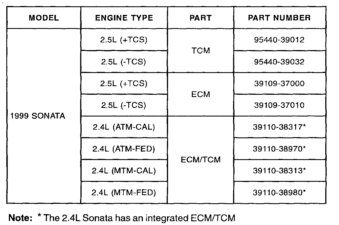 The 1999 Sonata's ECM/TCM is located on the vehicle's center tunnel, at the extreme forward end of the center console. The step by step procedure describes the removal and replacement process.