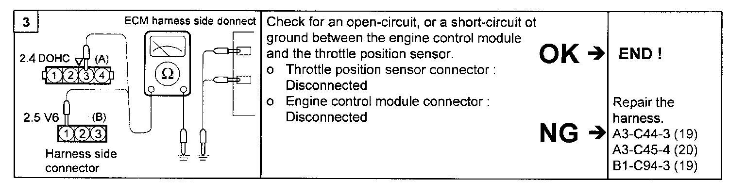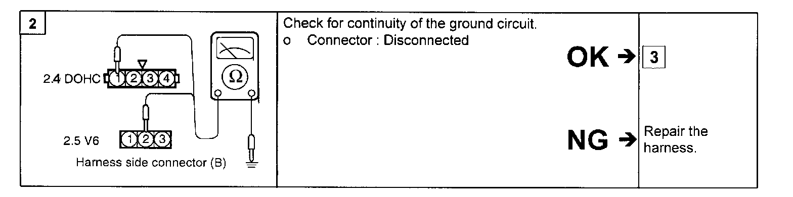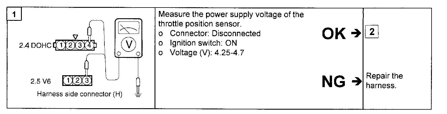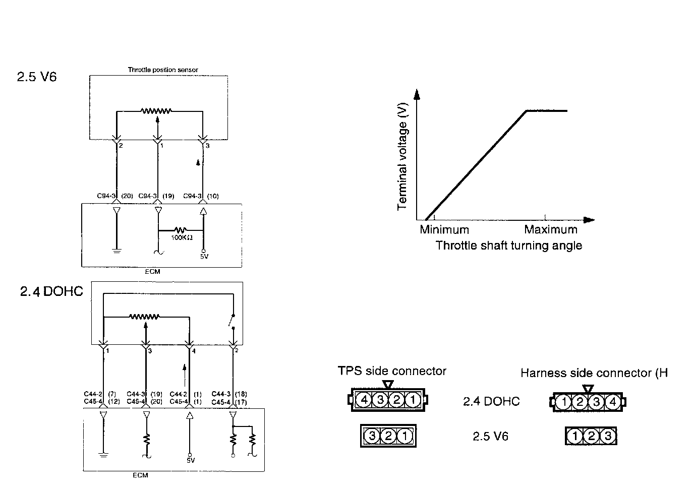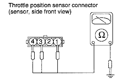 2. Measure resistance between terminal 1 (sensor ground) and terminal 4 (sensor power) for 2.4 DOHC between terminal 2 (sensor ground) and terminal 3 (sensor power) for 2.5 V6.