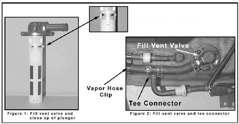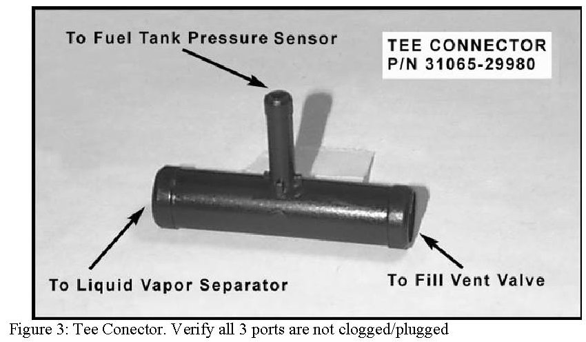 In addition, verify the plastic Tee connecting the fill vent valve, liquid vapor separator and two way valve is clear by removing and inspecting the Tee connector (part no. 31065-29980; figures 2 and 3).