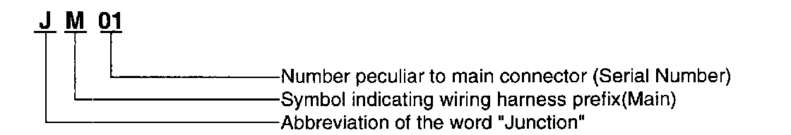 A Junction Block identification symbol consists of a wiring harness location classification symbol corresponding to each wiring harness location and number peculiar to the Connector in the junction block.