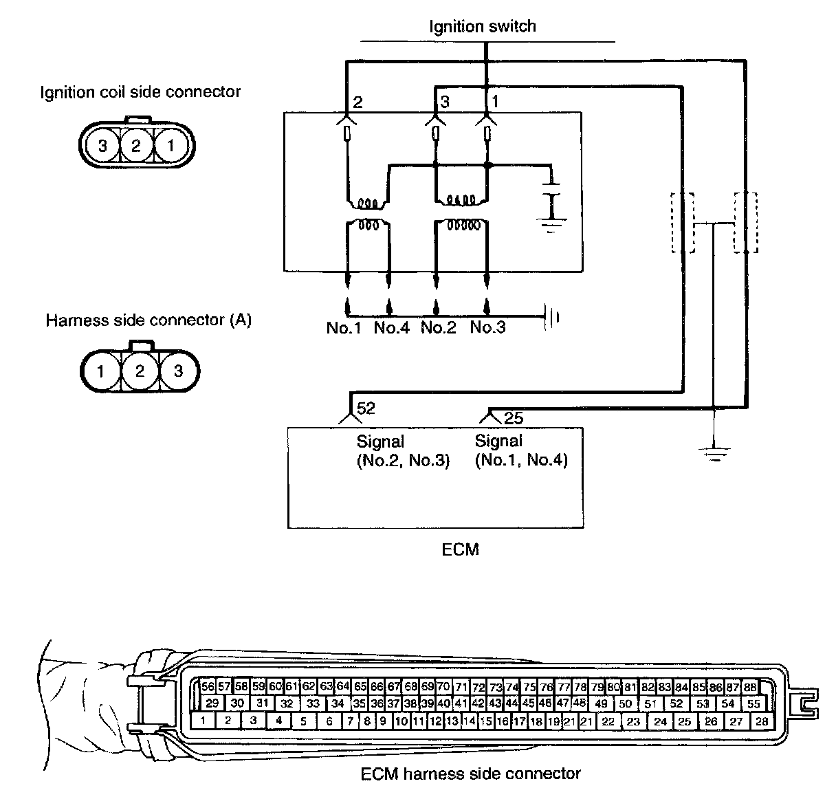 1. Measure the resistance between connector terminals 3 and 2 (the coils at the No.1 and No.4 cylinder sides) of the ignition coil, and between terminals 3 and 1 (the coils at the No.2 and No.3 cylinder sides).