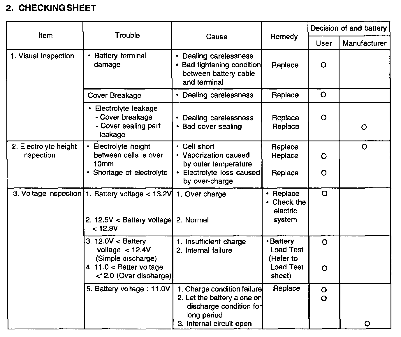 3. If the battery voltage (left alone within 2 hours after recharging) is over 12.5V and the voltage after load test is over the standard value, this battery can be used.