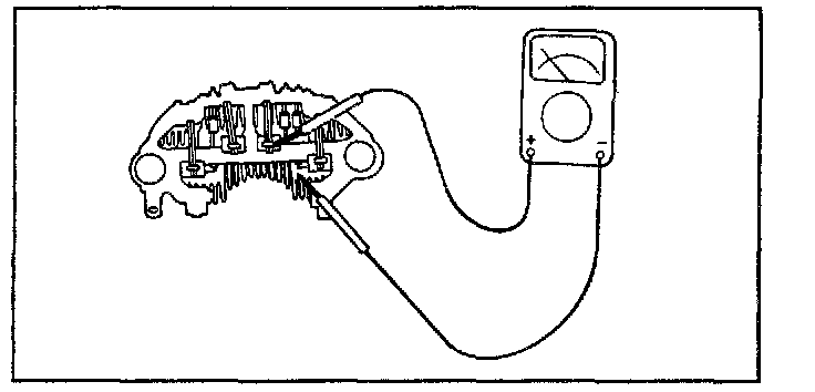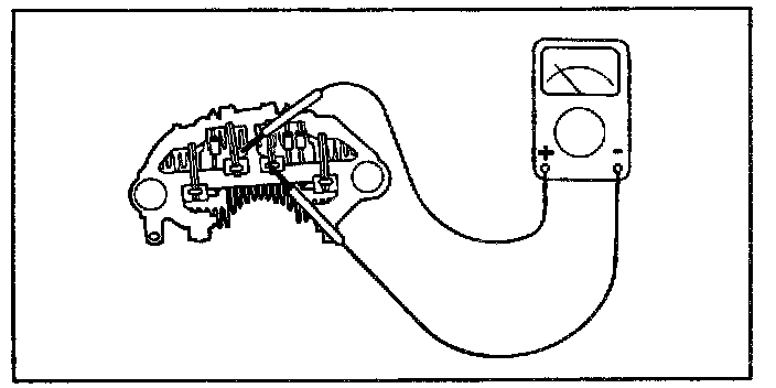 Check for continuity between the positive rectifier and stator coil lead connection terminal with an ohmmeter. The ohmmeter should read continuity in only one direction. If there is continuity in both directions, a diode is shorted. Replace the rectifier assembly.