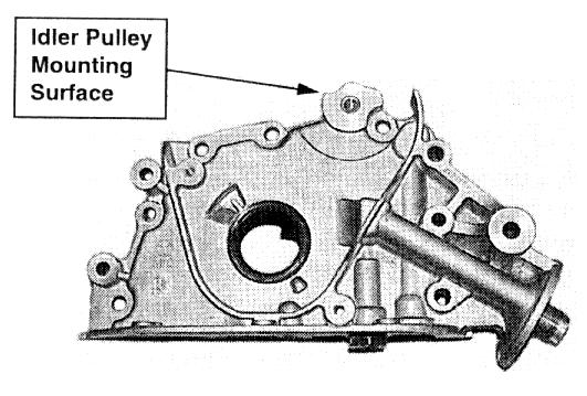 2. Front case assemblies produced before 9/22/99 may have a mismachined idler pulley mounting surface that is not parallel with the front face of the cylinder block. This can cause the timing belt to "walk off" the gears and into the front dust covers.
