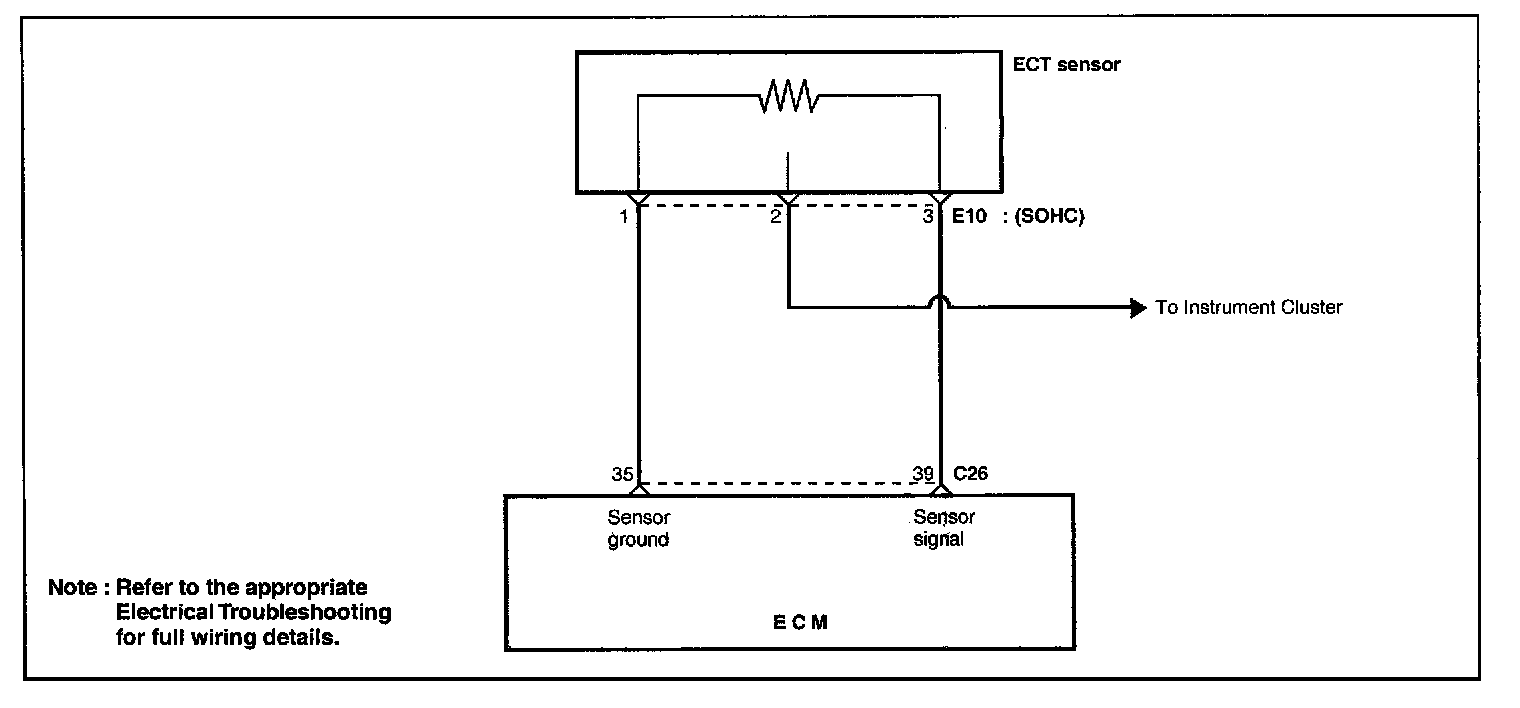 The engine coolant temperature sensor, located in the engine coolant passage of the cylinder head. It detects the engine coolant temperature and relays signals to the ECM. It employs a thermistor which is sensitive to changes in temperature. The electric resistance of a thermistor decreases in response to temperature rise. The ECM judges engine coolant temperature by the sensor output voltage and provides optimum fuel enrichment when the engine is cold.