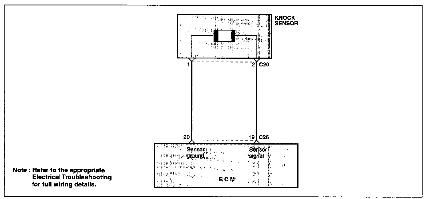 The knock sensor is attached to the side of the cylinder block to sense engine knocking. A knocking vibration from the cylinder block is applied as pressure to the piezoelectric element. This vibrational pressure is then converted into a voltage signal which is relayed to the ECM. If engine knocking occurs, ignition timing is retarded to suppress it.