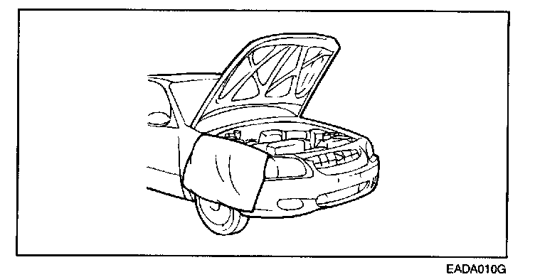 Always be sure to cover fenders, seats, and floor areas before starting work.CAUTION: The support rod must be inserted into the hole near the edge of the hood whenever you inspect the engine compartment to prevent the hood from falling and possible injuring you.