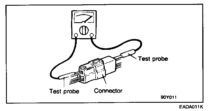 11. When using a circuit tester to perform continuity or voltage checks on connector terminals, insert the test probe from the harness side. (back probe)