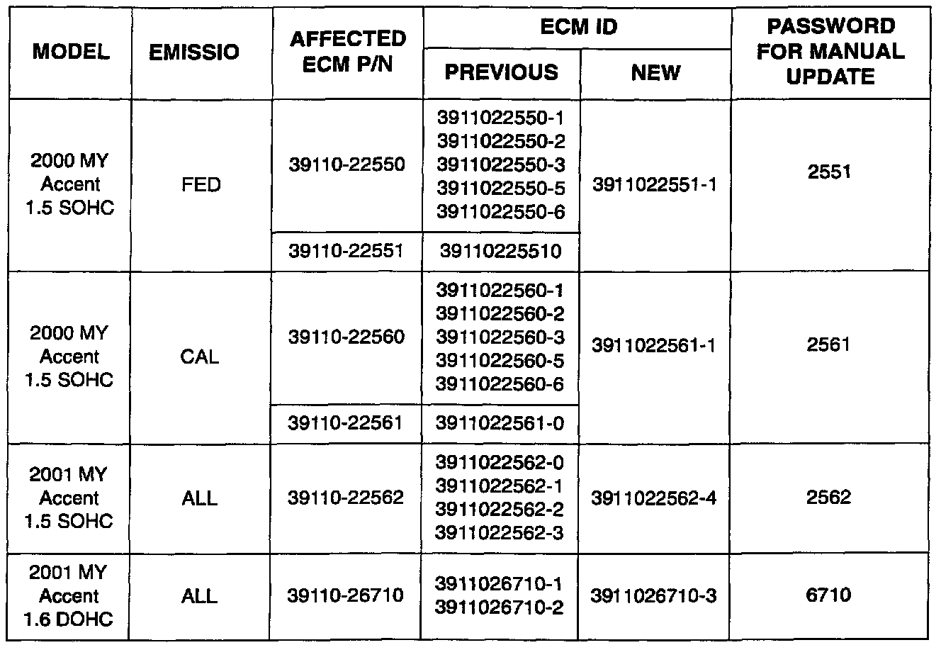 2000-01 ACCENT ECM PROGRAMMING FOR READINESS CODE